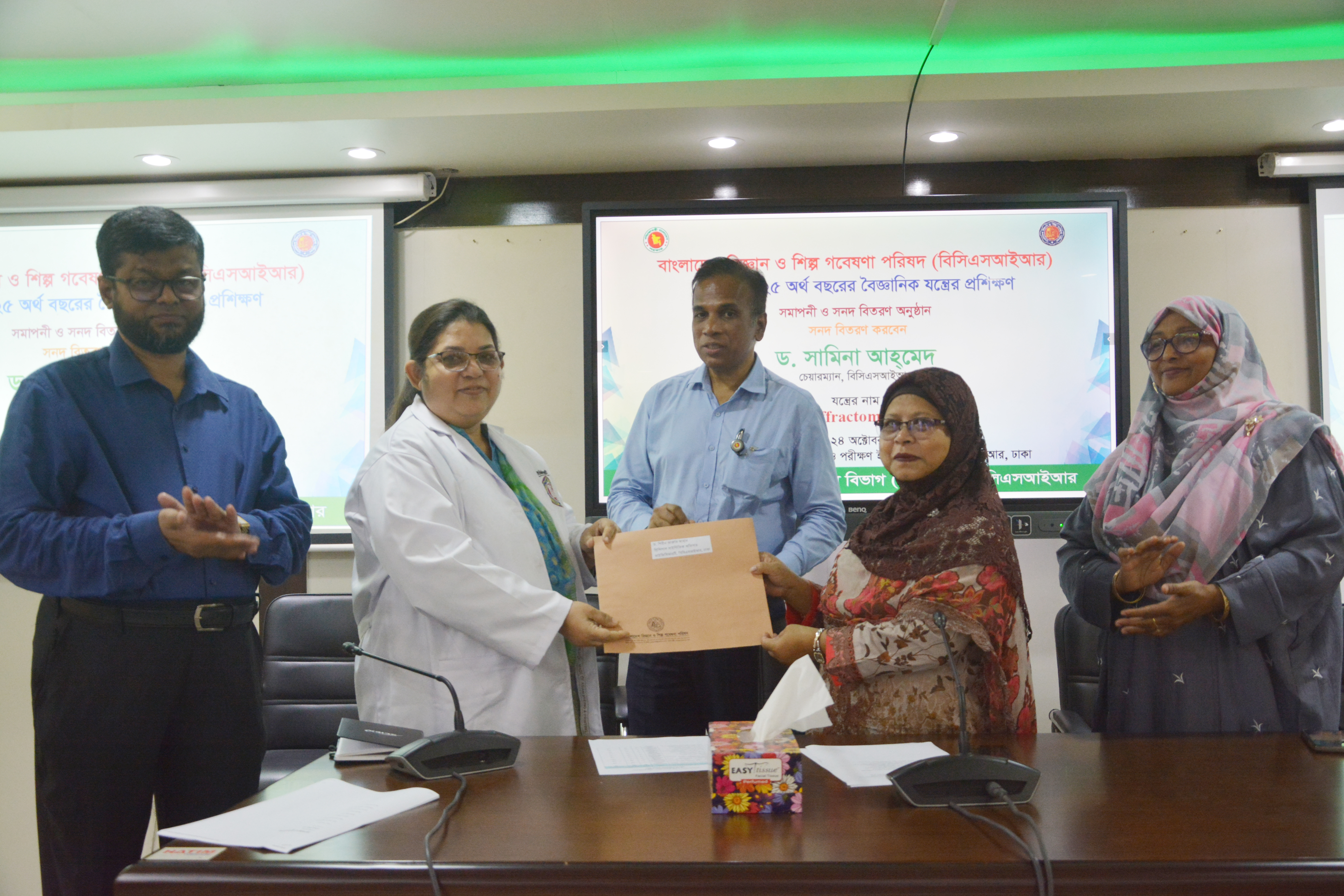 The certificate giving ceremony of Inhouse training on Scientific Instrument of 'X-ray Diffractometer (XRD)' Chief Guest Dr. Samina Ahmed, Chairman, BCSIR. Special guest: Mr. Rokonuzzaman, Member (Admin) (Addl. Charge) & Member (Finance), BCSIR and Dr. Most. Hosney Ara Begum, Member (S&T) (Routine. Charge). Director (Addl. Charge) of Planning and Development Division, Dr. Md. Hossain Sohrab and other Scientists were present there. Date: 24/10/2024
